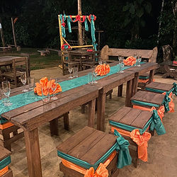 - Decoración de sillas en mesas con telas de color de su preferencia. - Centros de mesas, copas de vino, vasos de vidrio. - Velas de pila, marco de guaduas. - Mesa aparte de madera para colocar tortas, regalos, etc.